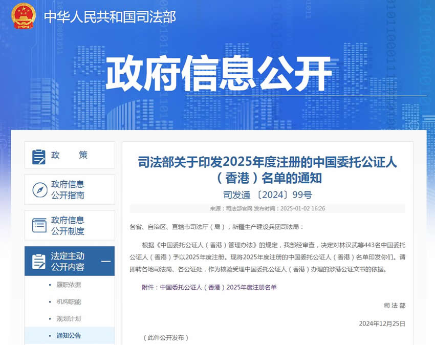 司法部關(guān)于印發(fā)2025年度注冊(cè)的中國委托公證人(香港)名單的通知